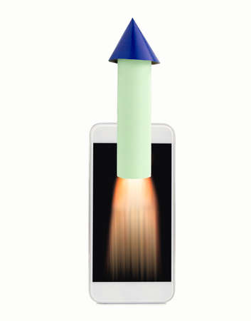 rocket launching from smart phone. Start up business concept for mobile app development or other disruptive digital business ideas and connection speed with white background
