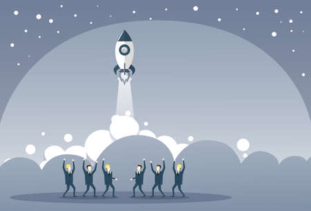 Business People Group Looking At Launching Space Ship New Stratup Strategy Development Concept Vector Illustration