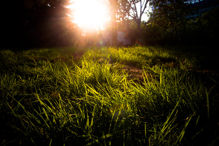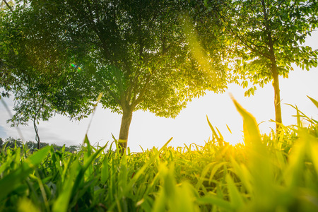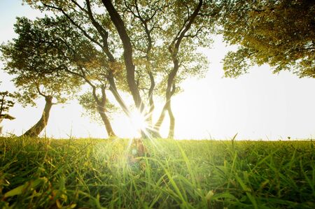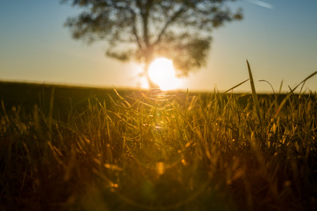 Spring nature landscape at sunset. Sun shines through tree and illuminating green grass