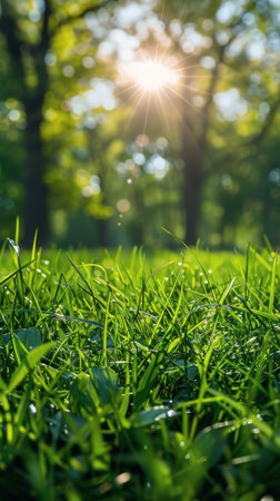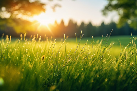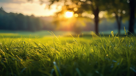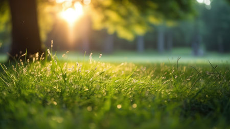 Captured at sunrise, this image showcases morning dew clinging to fresh green grass, illuminated by soft sunlight, creating a serene and vibrant outdoor atmosphere.