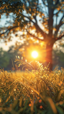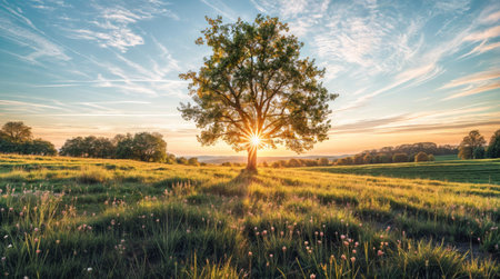 A golden sunset bathes a grassy field in warm light, with a majestic tree silhouetted against the sky The sun's rays create a magical glow, highlighting the delicate details of the meadow This serene image evokes a sense of peace and tranquility AI Generative