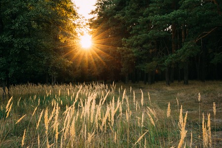 Sunset Or Sunrise In Forest Landscape. Sun Sunshine With Natural Sunlight And Sun Rays Through Woods Trees In Summer Forest. Beautiful Scenic View