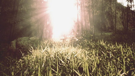 Beautiful summer landscape with green grass and sunbeams in the forest