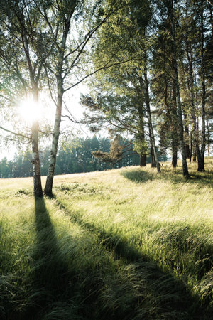 Beautiful, fresh, green grass growing in the summertime meadow. Rural summer scenery during sunrise hours in Northern Europe.