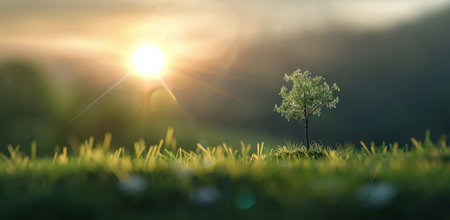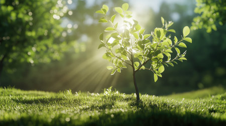 A young tree sprouting in a lush green field, with sunlight filtering through the leaves, symbolizing growth and nature.