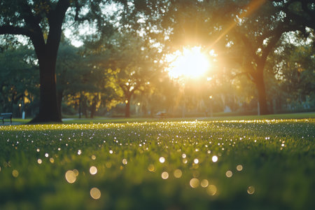 Sunlight breaks through trees, illuminating dew droplets on lush grass. The serene park atmosphere reflects the calmness of early morning, enhancing natural beauty.