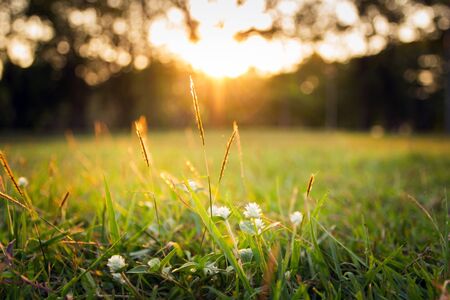 Vibrant meadow grass close up on sunset. Bright local landscape image.