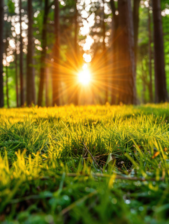 The suns rays filter through the dense canopy of trees, casting shadows on the lush grass below. The scene is illuminated by the golden light, creating a serene atmosphere in the forest.