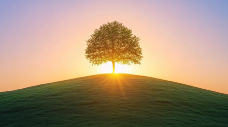 Golden-hour sunset with a single tree on a grassy hill, tranquil and serene, as the sky shifts from orange to deep purple