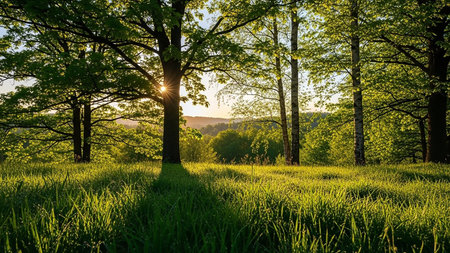 Lush green meadow with dew drops and tall trees bathed in warm golden morning sunlight during sunrise.