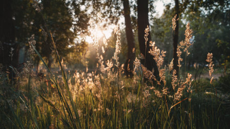 Golden sunlight illuminates tall grass swaying gently in a peaceful meadow during late afternoon creating a calm and warm atmosphere.