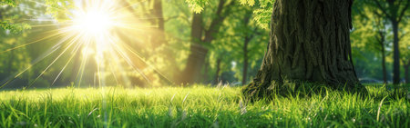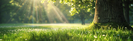 Morning light filters through a tall tree, casting a warm glow over the dewy grass. Sunbeams rise, illuminating the beauty of nature and inviting new beginnings in a peaceful setting.