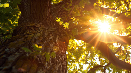Summer solstice. Embrace healing power of nature by hugging ancient trees and immersing yourself in the tranquility of a sun-dappled forest, fostering a sense of connection and well-being.
