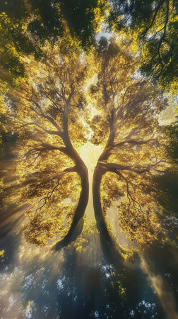 Symmetrical sunlight streaming through twin trees creating luminous canopy. Natures beauty and balance concept