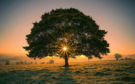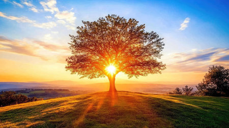 A majestic, solitary tree stands strong on a grassy hill, its silhouette a symbol of life and resilience. The morning sun peeks through its branches, casting a hopeful glow and heralding a new day filled with peace, growth, and quiet strength.