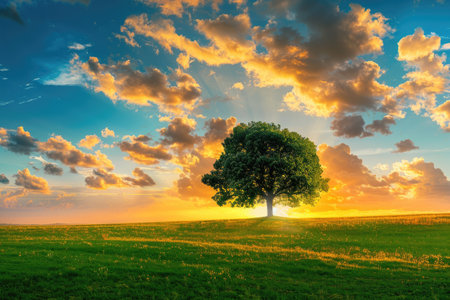 Serene sunset scene with a tree sheltering on a lush meadow. Concept Natural Landscape, Sunset Photography, Tranquil Setting, Tree Silhouette, Meadow Bliss