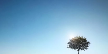 A single tree stands alone against a vast blue sky. The sun shines brightly illuminating the trees leaves while casting a gentle shadow on the ground.