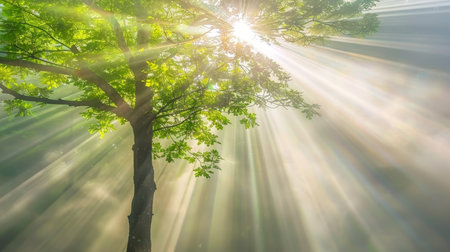 An awe-inspiring tree stands alone in a misty landscape, with soft rays of sunlight breaking through the clouds, creating a serene and tranquil atmosphere.