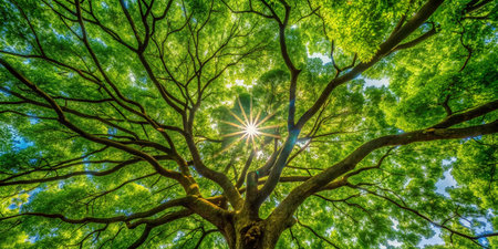 A captivating view looking up through a vibrant green tree canopy, as sunlight breaks through, creating a peaceful atmosphere in this serene forest environment.