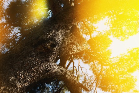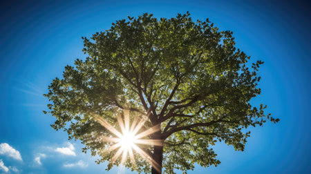 Sunlight beaming through lush foliage against blue sky. Natural background.