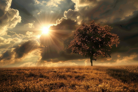 Golden sunlight breaks through dramatic clouds, illuminating a solitary tree in a field of flowers, creating a peaceful and serene atmosphere at sunset.