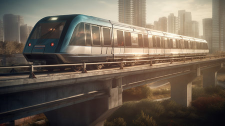 A panoramic view of a city skyline, with a sleek metro train passing in the foreground, demonstrating the seamless integration of public transit into the urban landscape.