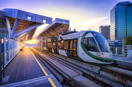 Kaohsiung, Taiwan -- March 2, 2018: A train of the new light rail system pulls into the Love Pier station at sunset time.