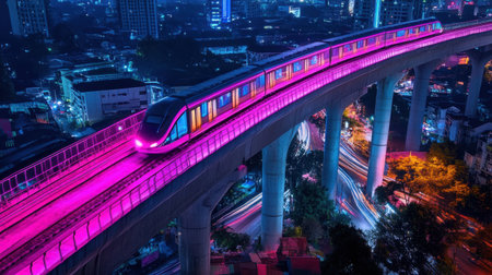 A vibrant pink train glides smoothly on an elevated track at night, surrounded by a dazzling cityscape. The illuminated skyline highlights modern urban transport.