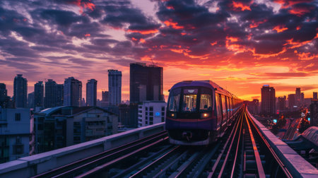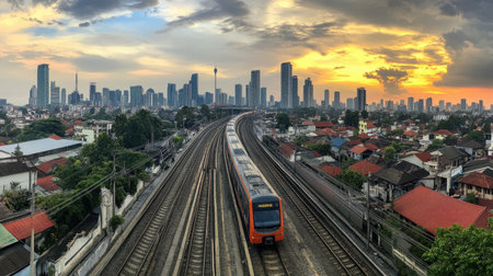 A stunning wide angle view of a Jakarta MRT train against a vibrant sunset, showcasing the dynamic urban landscape and modern infrastructure of the city.
