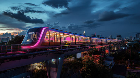 A vibrant elevated train glides above a city at dusk, showcasing modern urban transport. The scene captures the sleek design and colorful lights against a dramatic skyline.