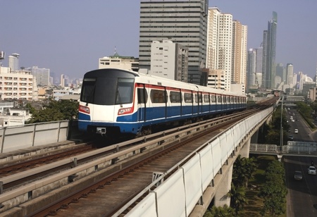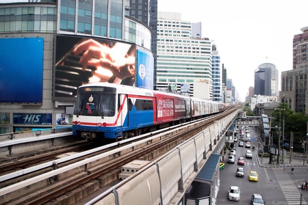 BANGKOK - August 10: A BTS Skytrain runs through the city centre on August 10, 2014 in Bangkok, Thailand