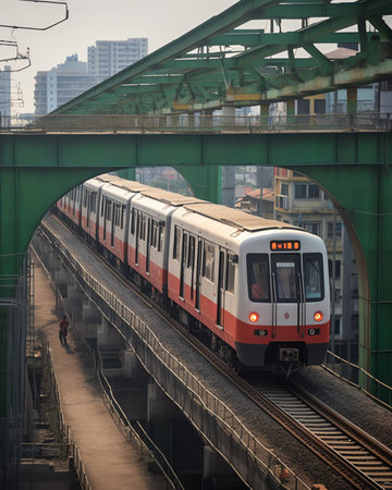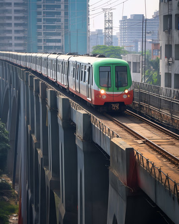 An elevated railway track winding through a bustling city, with a sleek train gliding above traffic, showcasing the role of mass transit in urban mobility.