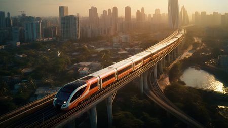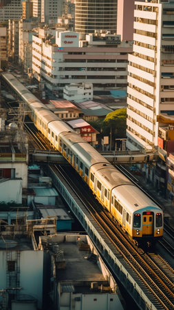 Generative AI : Bangkok Thailand 11 December 2022 Aerial view of a subway train on a suspended railroad in Bangkok downtown Thailand
