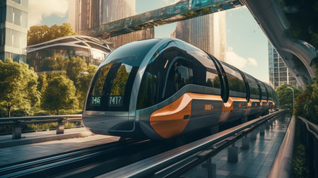 Futuristic Train Traveling Through a City Next to Tall Buildings