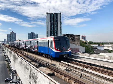 Bangkok-Thailand AUG 9 2019: BTS Sky Train on cityscape background in daytime , Sky Train is a mass transit system in Bangkok to assist facilitate and fast journey
