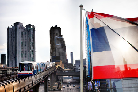 Skytrain in downtown Bangkok. Skyscraper and banner in Thailand. Transport