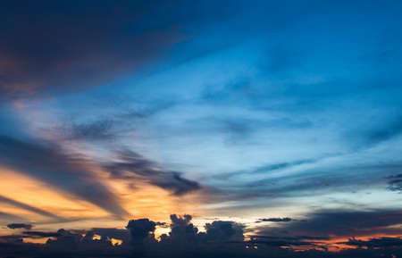 Sunset sky. Abstract nature background. Dramatic blue and orange, colorful clouds at twilight time.