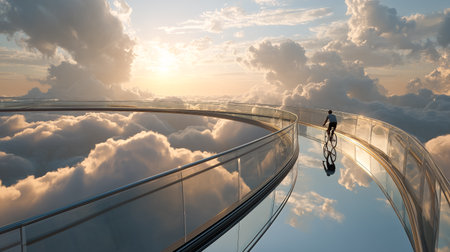 A surreal image of a cyclist riding on a road suspended above the clouds, creating a dreamy scene. The road's reflective surface mirrors the sky, enhancing the sense of altitude and adventure.