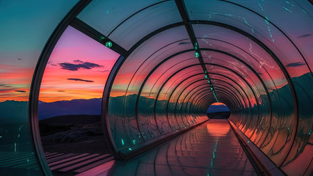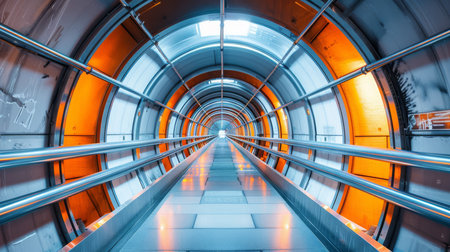A striking perspective of a contemporary modern tunnel beautifully illuminated with captivating blue and orange lights
