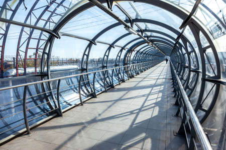 Pedestrian bridge from steel and glass for crossing over the railway tracks in Samara, Russia