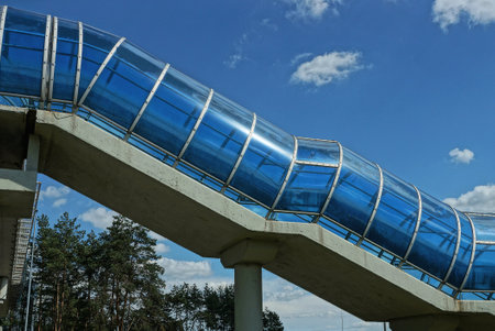 part of a pedestrian crossing from a long blue plastic tunnel on a concrete foundation above a road against a sky