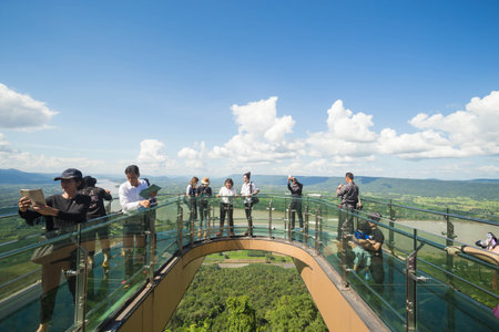Nong Khai, Thailand - OCT 13 : Tourist are walking on skywalk in the Wat Pha Tak Suea on october 13, 2017.