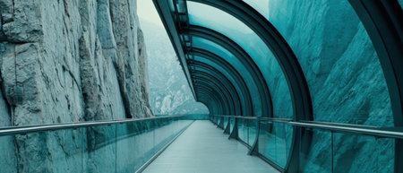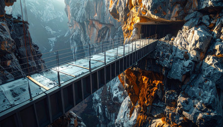 A walkway made of glass stretches along a mountain edge. The path is surrounded by steep rock formations and has a clear view of the landscape.