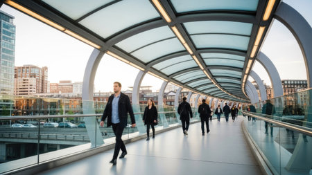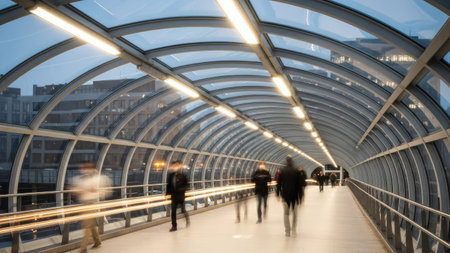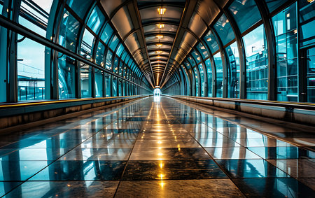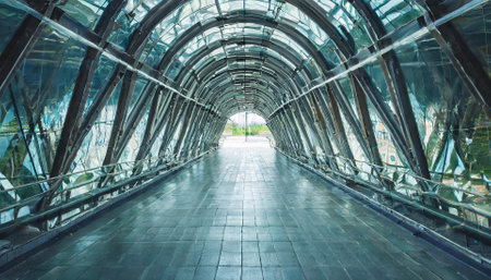 A long, elevated walkway is the central focus, showcasing a modern architectural design. The composition emphasizes geometric patterns and the play of light. Sunlight streams through glass panels, casting shadows and highlighting the metallic framework. This image might be suitable for commercial purposes or editorial use.