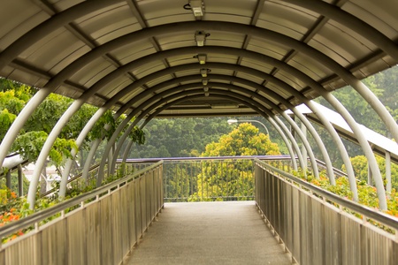 A modern pedestrian bridge featuring linear design and shadow lines, surrounded by greenery in an urban setting. Ideal for transportation or travel themes.