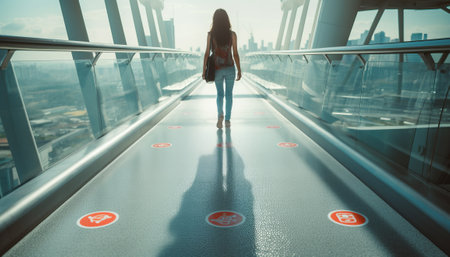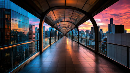 An interior perspective shows an elevated walkway. The structure features large windows offering views of nearby city buildings. Natural lighting illuminates the scene creating strong shadows. This image is suitable for use in design projects, architectural visualizations, and commercial applications.