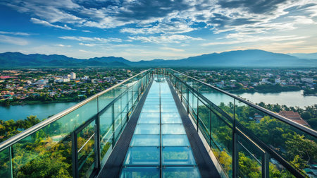 A bright summer day at the Skywalk in Kanchanaburi, Thailand, with the transparent glass deck offering stunning views of the city's skyline and the peaceful river below.