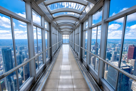 Glass corridor extending over Chicago's urban skyline, offering breathtaking views from a skyscraper