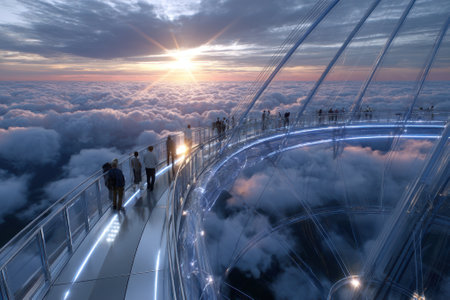 Groups of people stroll along a futuristic walkway, enjoying a stunning sunrise above the clouds.