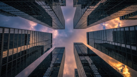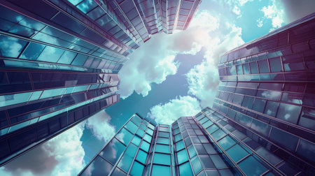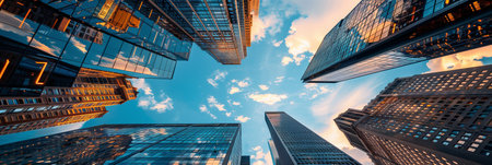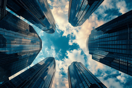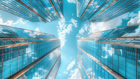 Bottom view of multiple high-rise buildings with reflective glass facades, reaching into the sky in a powerful display